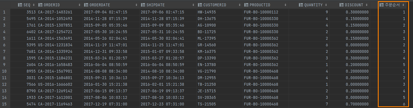 from (select o.*, row_number() over (partition by PRODUCTID order by ORDERDATE) as 주문순서