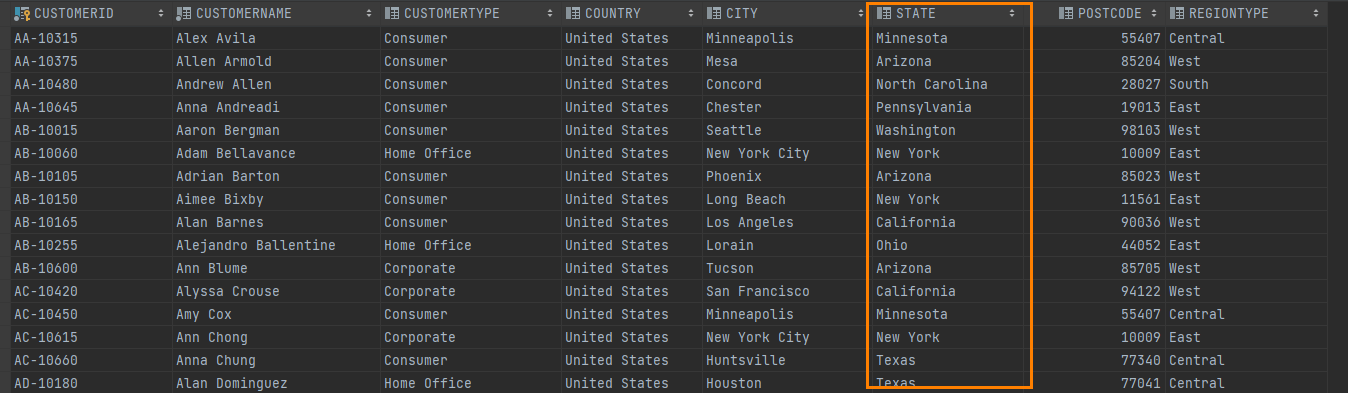 여기에 STATE라는 컬럼이 있는데, 이는 고객의 주소로 등록된 주가 어디 인지를 나타내는 컬럼입니다.