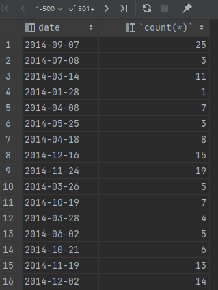 위와 같이 group by 절에 date_format 함수를 사용하여 년, 월, 일로 ORDERDATE 컬럼을 표현하면서 묶어줍니다. 그리고나서 count(*)를 하면 쉽게 일별 주문건수를 출력 할 수 있습니다.
