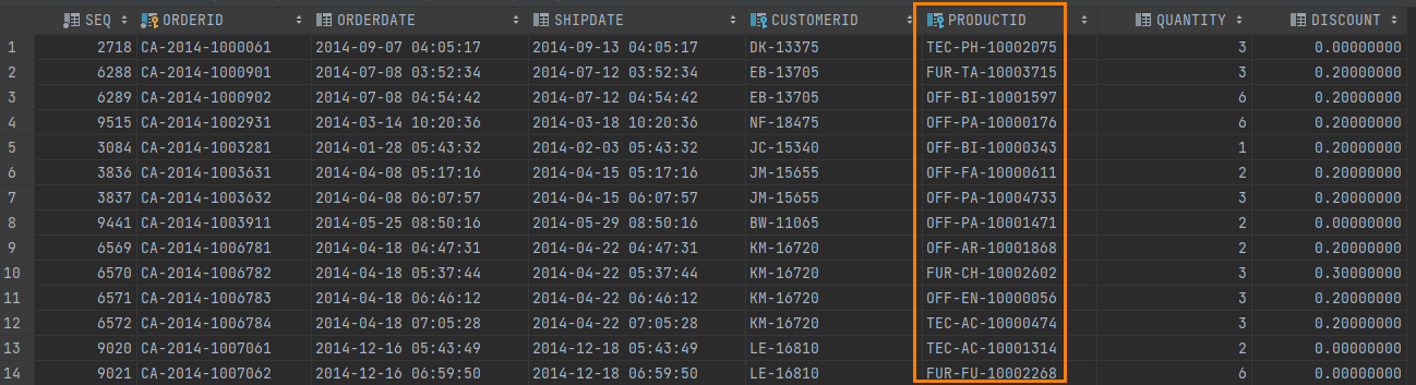 그리고 여기에서 각 PRODUCTID별로 첫번째로 들어온 주문의 주문정보를 불러와 보겠습니다.