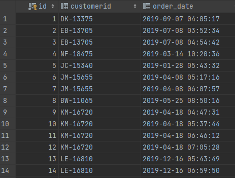 여기서 주의 하실것이 단순하게, 첫번째 주문일자를 구하는것 이라면 group by를 통해서 min(ORDERDATE)로 뽑아 올수 있지만, 다른 컬럼들의 정보까지 다 가지고 오려면 group by 를 통해서 하기는 좀 복잡해 집니다. 또한 같은 시간에 주문한 경우 하나만 불러온다는 확실한 보장이 없기때문에 아래에서 소개해 드리는 로직을 사용하시는게 가장 확실 합니다.