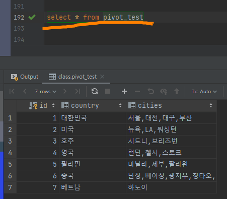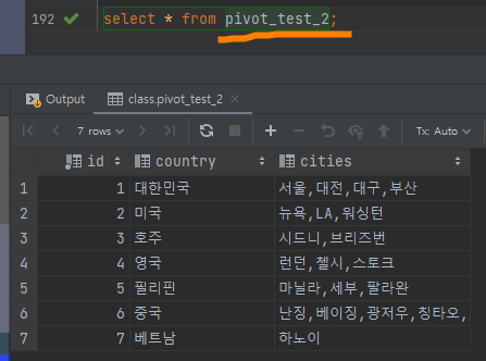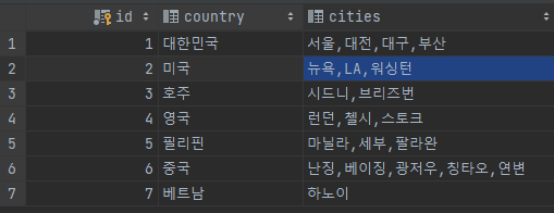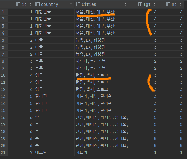 여기에서 이젠 cities 컬럼값중 콤마로 구분된 도시명을 하나씩 출력 되도록 하면 됩니다. 그럴때는 substring_index를 중첩으로 쓰면 됩니다. SQL을 보시면서 이해해 보시면 됩니다. (다음에 자세히 정리를 해볼께요!) 그럼 최종적으로 위에서 미리 봤던 결과가 나오게 되는것 입니다.