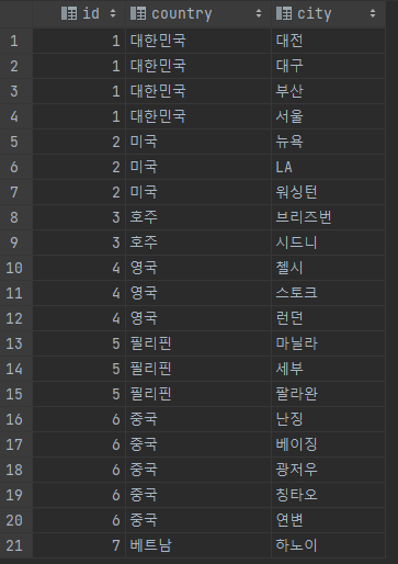 여기에서, id, country, cities를 출력하고, 그다음 행에서 다음과 같이 기술 되어 있습니다.