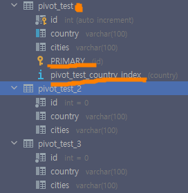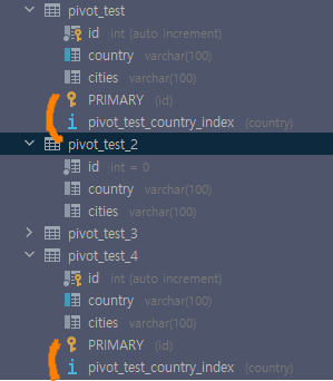 그림을 보면 pivot_test 테이블에는 primary와 index가 있지만, 나머지 pivot_test_2, pivot_test_3 에는 없는 것을 확인 할 수가 있습니다. 그럼 이런것 까지 모두 가지고 오는 방법은 뭐가 있을까요? 없을까요?