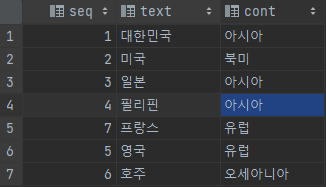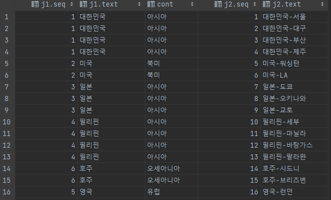 그래서 결국, substring_index(j2.text, '-', 1) 의 결과는 분리한 데이터에서 첫번째 텍스트를 반환하는데, "대한민국-서울" 에서 "-"로 분리하고 난 첫번째 텍스트 조각인 "대한민국"만 반환을 하게 됩니다. 그럼 자연스럽게 join1 테이블의 text 데이터와 일치하게 되는것 이죠. 이렇게도 조인을 할 수 있답니다.