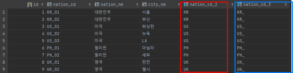 이렇게 생성 하면 virtual 컬럼이 생성이 된것 이고, left(nation_cd_2) 한 결과는 select 할때마다 서버에서 계산이 되어 출력이 됩니다. 저장이 되어 있는게 아니라는 것 이죠. 저장을 하는 방식으로 하려면 다음과 같이 하시면 됩니다.