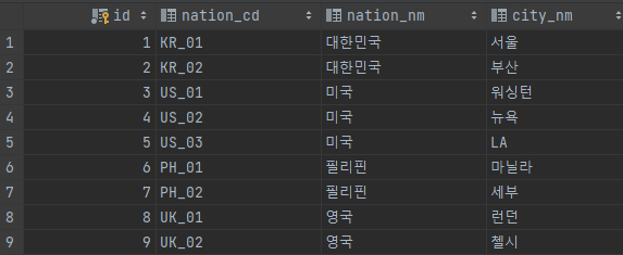 INSERT INTO virtual_table (id, nation_cd, nation_nm, city_nm) VALUES (1, 'KR_01', '대한민국', '서울');