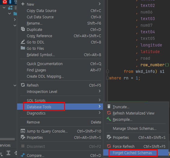 우선 왼쪽 트리에서 unknown으로 나오는 DBMS위에서 우클릭을 시전합니다. 그리고 Database Tools로 가고, 거기서 Forget Cached Schemas를 클릭 합니다. 그러면 다음과 같이 트리가 나오게 됩니다.