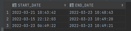 INSERT INTO TIME_GAP (START_DATE, END_DATE) VALUES (TO_DATE('2022-03-21 10:43:42', 'YYYY-MM-DD HH24:MI:SS'), TO_DATE('2022-03-23 10:48:43', 'YYYY-MM-DD HH24:MI:SS'));