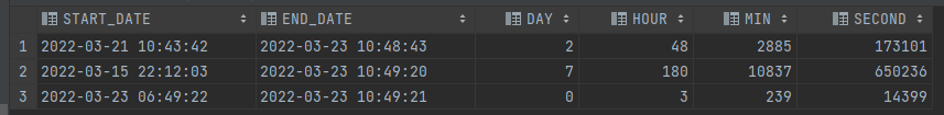, trunc((END_DATE - START_DATE) * 24 * 60 * 60, 0) as second