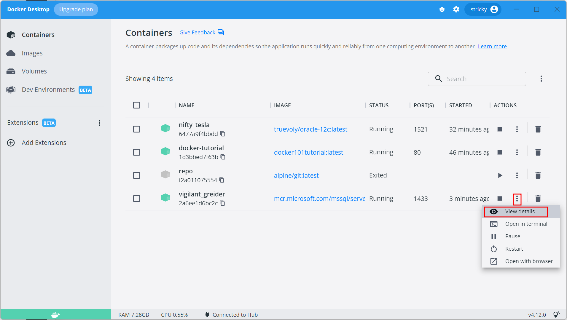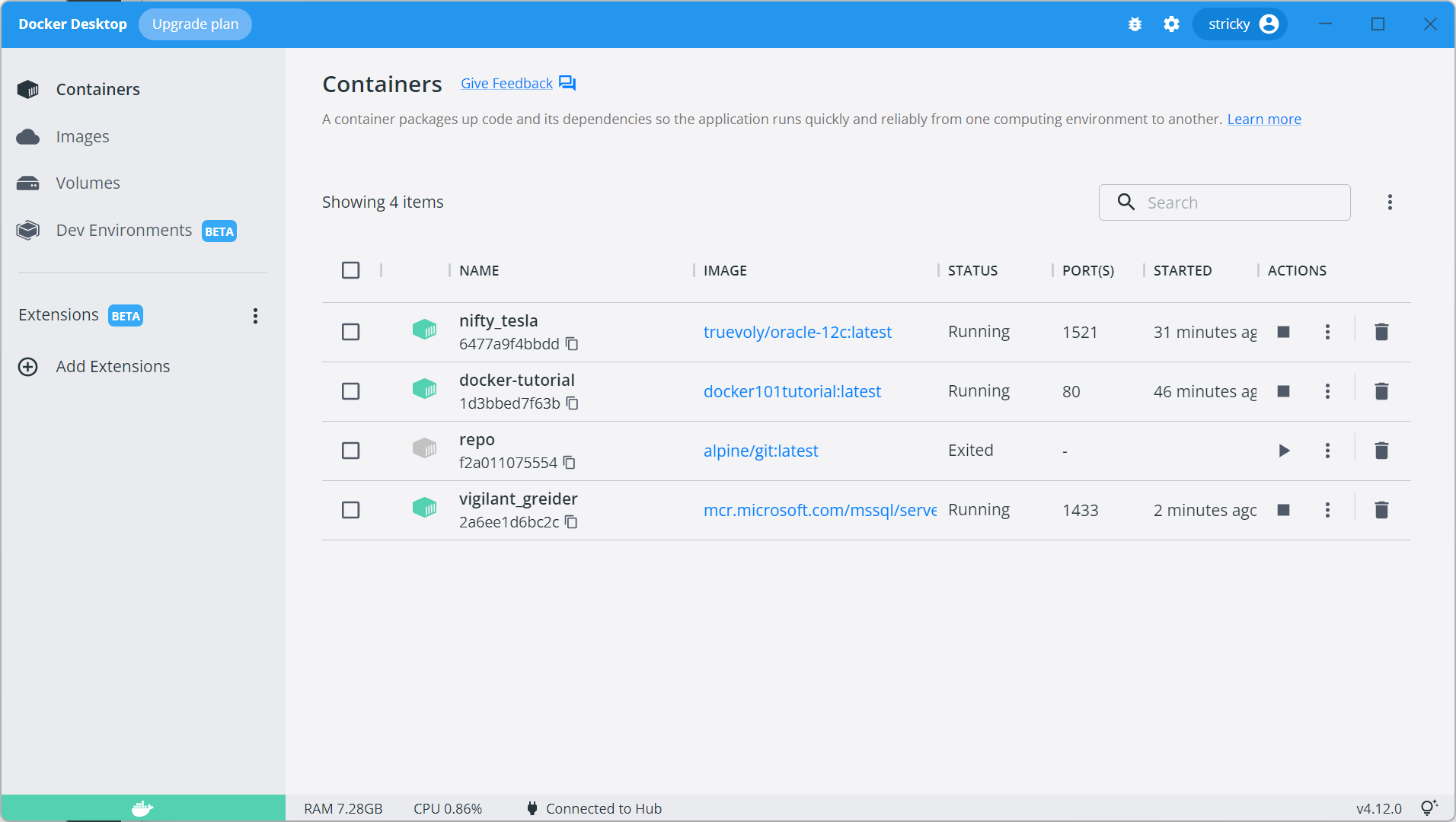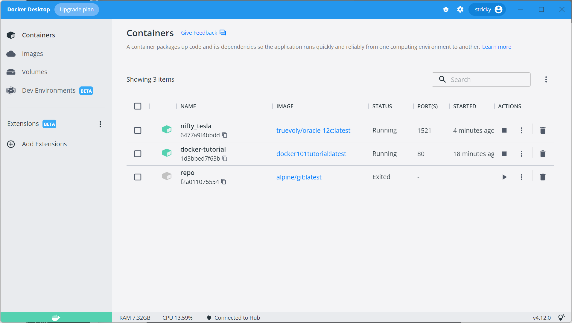 자, 이젠 다시 docker 프로그램을 열어 볼께요. 그럼 Containers에 truevoly/oracle-12c:latest 가 보이실겁니다. 잘 실행되고 있네요!