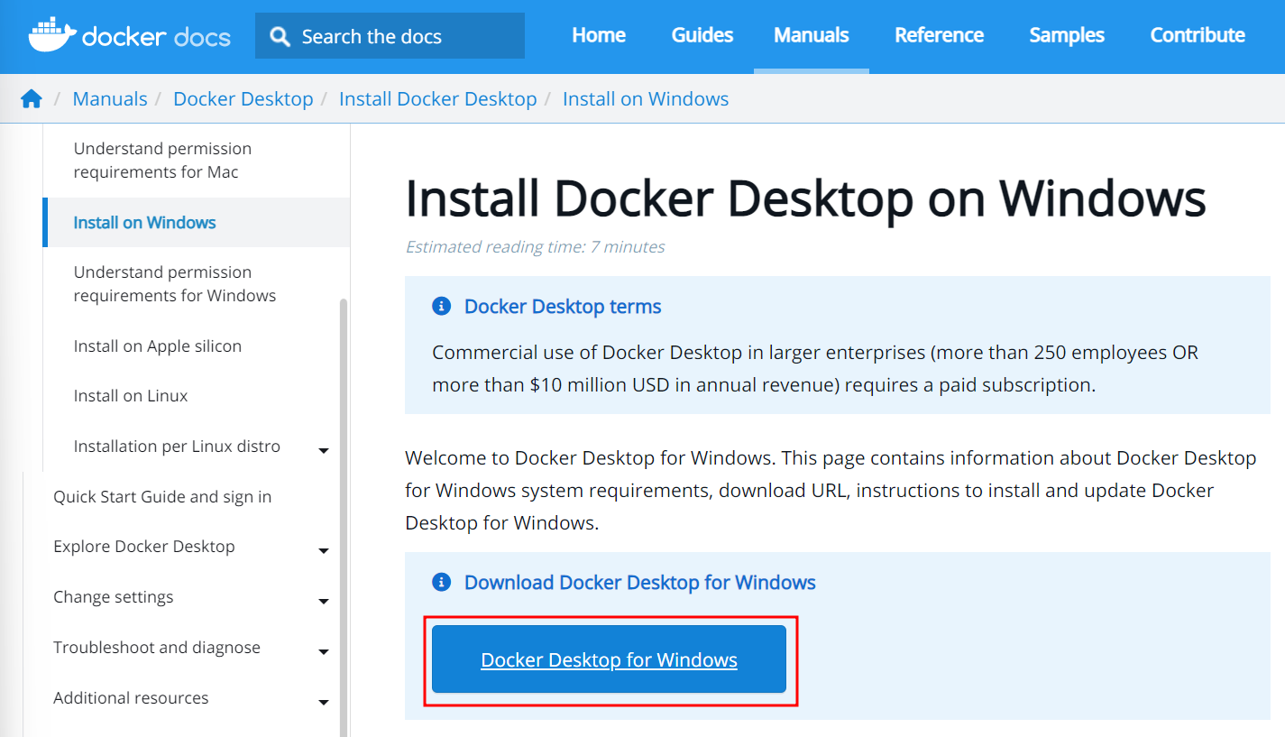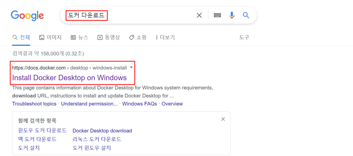 맥을 쓰시는 분들과 위 설정을 모두확인 하신 윈도우 유저분들은 구글에서 <도커 다운로드> 라고 검색하시고 가장 위에 보이는 링크를 클릭 하시면 됩니다.