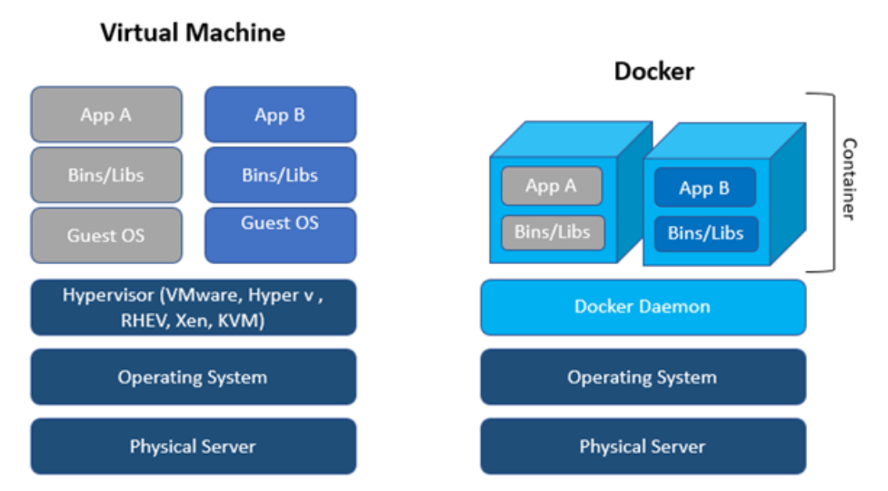 위 그림에서 오른쪽 Docker 부분을 보세요. 가장 아래 Physical Server 가 내 컴퓨터라고 생각하시고, 그 위에 Operating System이 윈도우나 맥OS가 되겠죠? 그리고 그 위에 Docker를 설치 할 것 이구요. 그 위에 컨테이너라는 박스 하나하나를 다운로드 받아 볼 것 입니다.