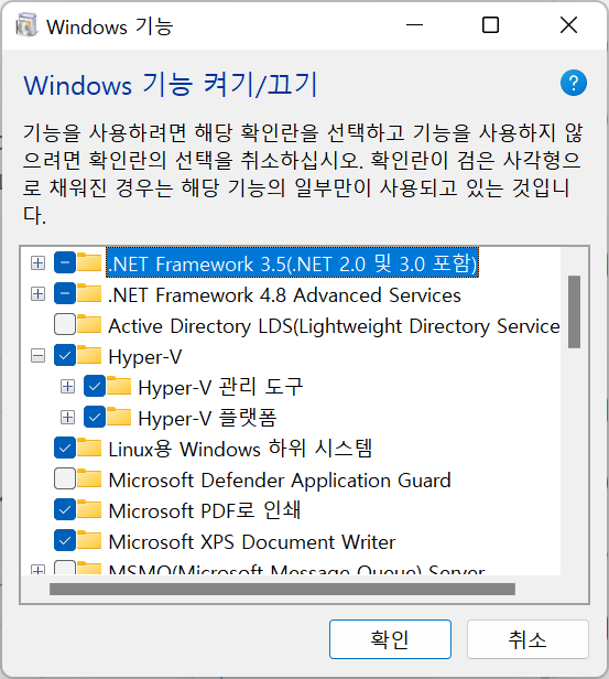 그리고 마지막으로 아래 Hyper-V 설정을 켜두셔야 합니다.