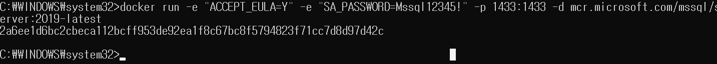 docker run -e "ACCEPT_EULA=Y" -e "SA_PASSWORD=Mssql12345!" -p 1433:1433 -d mcr.microsoft.com/mssql/server:2019-latest