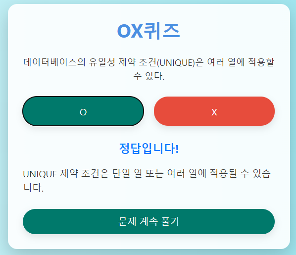 그리고, SQLD 문제은행 웹사이트를 통해서 문제를 많이 풀어보시면 좋은데, 이중에서 첨에 OX퀴즈를 많이 하시고 문제 풀기로 넘어가면 좋을실것 같습니다.