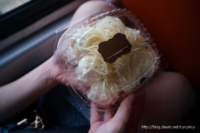 빵 자체는 엄청 부드러운 느낌의 빵이었고 , 그 위에 하얀 크림이 올라가 있고, 그리고 마무리로