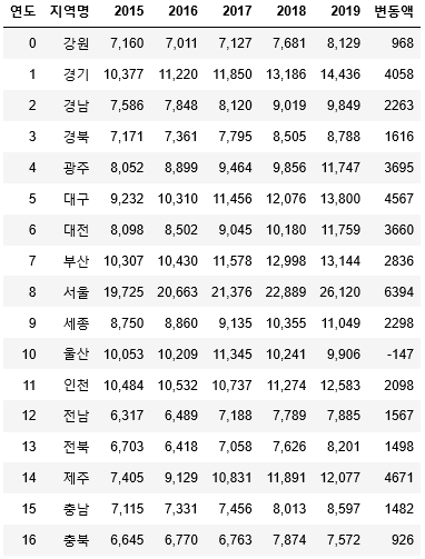 region_year['변동액'] = (region_year['2019'] - region_year['2015']).astype(int)